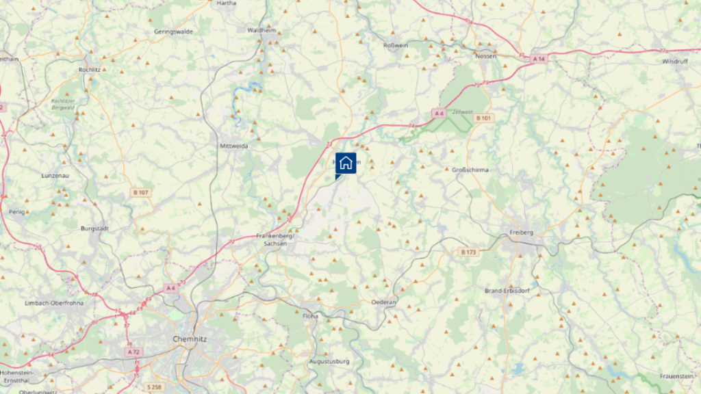 Der Bahnhof ist in ca. 15 min. fußläufig zu erreichen. Von hier aus gelangt man mit der City-Bahn in regelmäßigen Abständen, mit einer Fahrzeit von ca. einer halben Stunde, zum Hauptbahnhof Chemnitz. Die Autobahnanschlussstelle Hainichen erreichen Sie in ca.7 Fahrminuten.