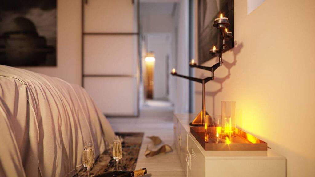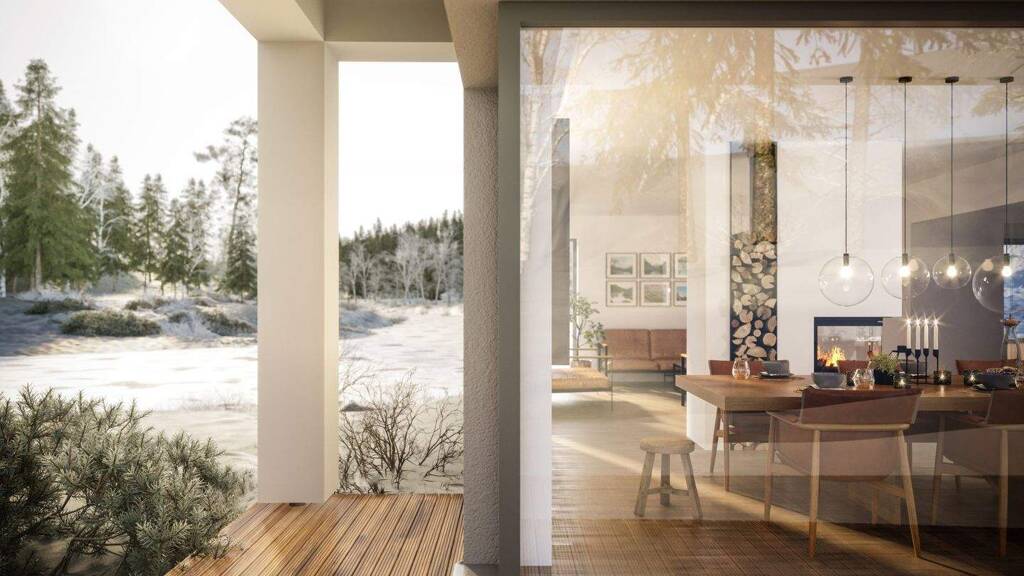 Das Innere des Hauses bietet trotz der kompakten Außenmaße ausreichend Bewegungsfreiraum für bis zu vier Personen. Das liegt nicht zuletzt an der durchdachten Raumaufteilung. Dreh- und Angelpunkt des Familienlebens ist das Erdgeschoss, wo sich der weitläufige Wohn-, Ess- und Kochbereich befindet. Schon vom Eingang aus fällt der Blick durch die Diele hinein in den lichtdurchfluteten Gemeinschaftsbereich. Besonders praktisch ist der zweite Zugang, der die Bewohner direkt in die Küche führt. So können schwere Einkäufe ohne Umwege schnell an ihren Platz gebracht werden. Zusätzliche Stellfläche und weiteren Stauraum bietet der Technikraum, der an die Küche angrenzt.