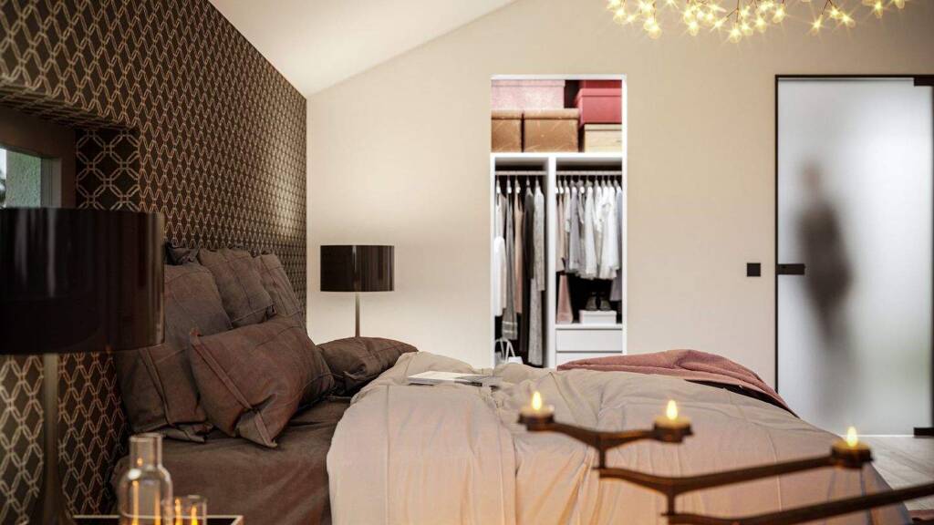 Über eine geradläufige Treppe gelangen die Bewohner in das Dachgeschoss, das die Privaträume beherbergt. Dank des hohen Kniestocks von 2 m herrscht auch hier oben eine großzügige und luftige Atmosphäre. Ein geräumiges Elternschlafzimmer mit Ankleide, zwei gleich große Kinderzimmer und ein gemütliches Bad mit Wanne und Dusche vervollständigen das Wohnglück.