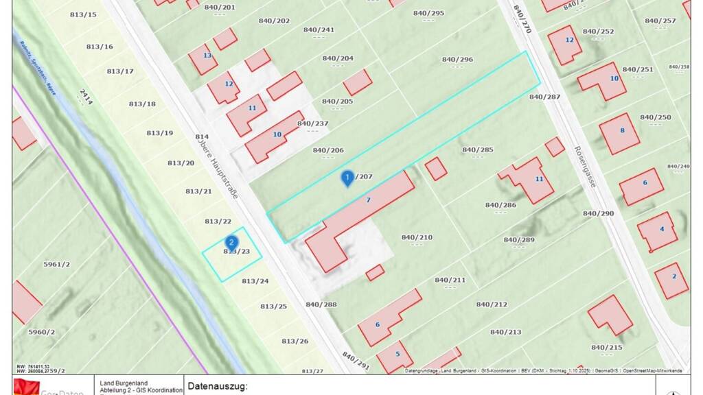 Es grenzt sowohl an die Obere Hauptstraße als auch an die Rosengasse. Daher wäre es sehr leicht in 2 verschiedene Grundstücke teilbar.