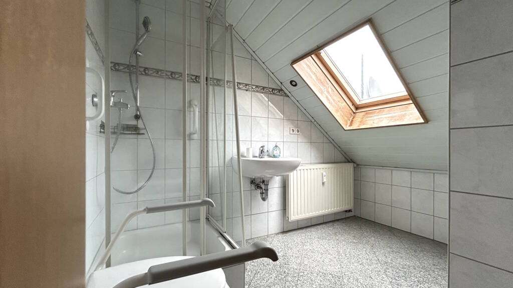 Über das Treppenhaus betritt man die dazugehörige DG-Wohnung, die mit 2 weiteren Räumen den Wohnraum ergänzt. Eines der Zimmer verfügt über Anschlussmöglichkeiten für Wasser, sodass hier eine kleine Küchenzeile eingebaut werden könnte, was eine vielfältige Nutzung des DG ermöglicht. Ein kleines Tageslichtbad mit Dusche, Toilette und Waschbecken ist ebenfalls vorhanden.