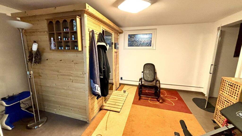 Der Vollkeller bietet vielseitige Nutzungsmöglichkeiten. Neben mehreren Abstellräumen stehen ein großer Hobby- bzw. Gästeraum sowie ein wundervoller Wellnessbereich mit Sauna und Dusche zur Verfügung.