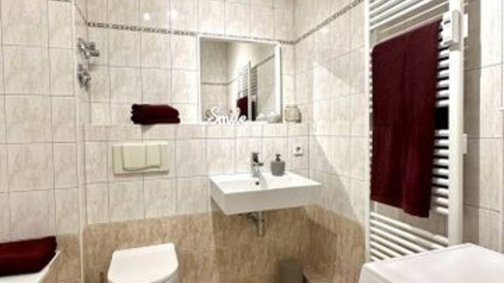 Das Bad bietet eine Wanne. Im Bereich des Bads befindet sich eine Waschmaschine.