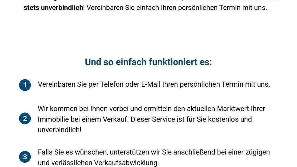 Sie planen derzeit oder zukünftig den Verkauf oder die Vermietung Ihrer Immobilie? Dann ist es notwendig und wichtig deren am Markt erzielbaren Preis zu kennen. Gerne unterstützen wir Sie hierbei kostenlos und schätzen professionell und unkompliziert den Wert Ihrer Immobilie ein.