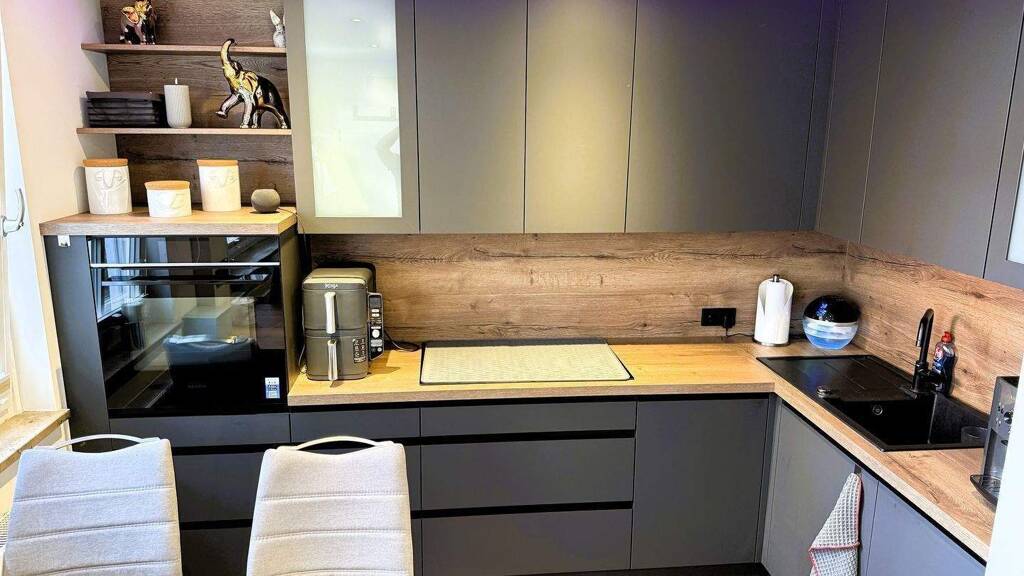 Sie betreten die nahezu barrierearme Wohnung und gelangen nach ein paar Metern in die neuwertige, von einem Tischler geplante und installierte Einbauküche mit erstklassigen Großgeräten der Marke Siemens. Die Einbauküche besticht durch matte, anthrazitfarbene Fronten und eine Arbeitsplatte sowie Nischenrückwand im Farbton „Halifax Eiche Tabak“, wodurch ein edles und modernes Erscheinungsbild entsteht. Zwei Fenster sorgen für viel Tageslicht.