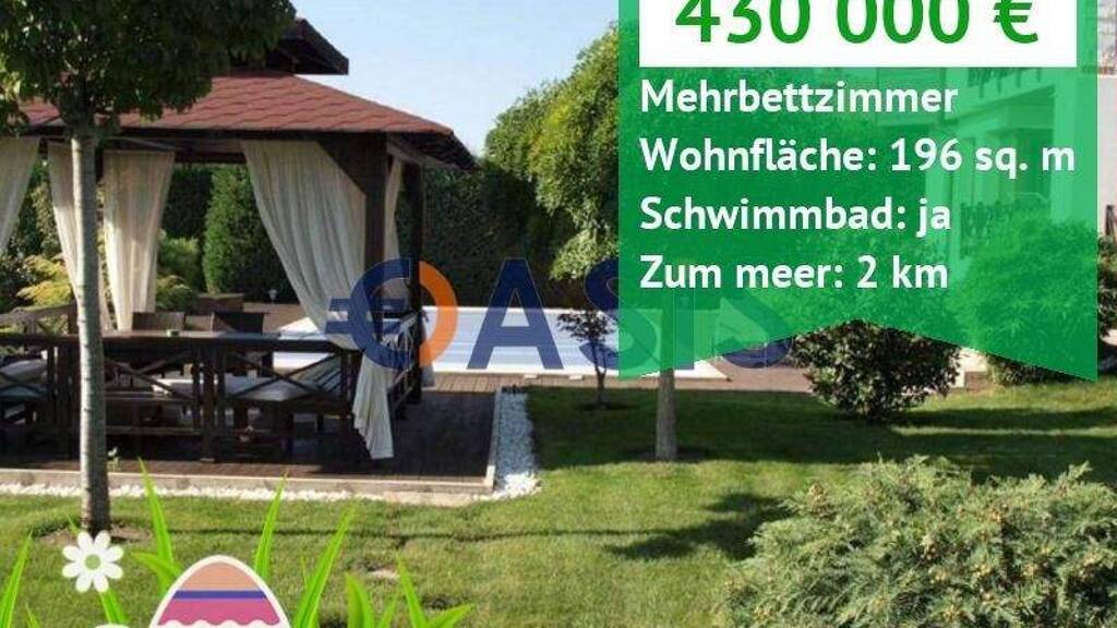 Das Haus befindet sich in einer ruhigen, grünen Gegend, nur 30 km vom Flughafen Varna entfernt, mit bequemem und schnellem Zugang zur Stadt und zum Meer. Es verfügt über einen Garten mit Grillplatz, einen Kinderspielplatz, ein Carport und eine überdachte Garage von 36 qm.