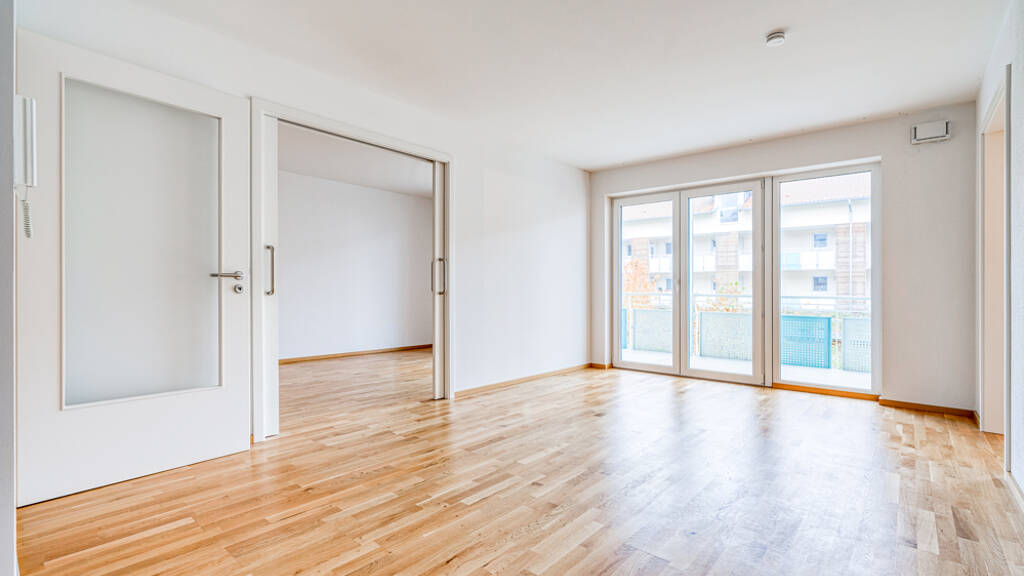 Beim Betreten der Wohnung gelangen Sie in den einladenden Flur. Auf der linken Seite befindet sich die hochwertige Einbauküche mit ausreichend Platz für einen kleinen Essbereich. Direkt angrenzend liegt eine praktische Abstellkammer mit Waschmaschinenanschluss, die zusätzlichen Stauraum bietet. Auf der rechten Seite erwartet Sie das großzügige Tageslichtbad mit moderner, ebenerdiger Dusche. Geradeaus gelangen Sie in das helle Wohnzimmer, das mit edlem Echtholzparkett überzeugt. Von hier aus erreichen Sie sowohl das Schlafzimmer als auch ein weiteres Zimmer, das sich ideal als Gästezimmer eignet. Die Räume sind durch elegante Schiebetüren miteinander verbunden, was eine flexible Nutzung ermöglicht. Sowohl vom Wohnzimmer als auch vom Schlafzimmer aus haben Sie Zugang zum überdachten Südbalkon, der zum Entspannen einlädt. Ergänzend zur Wohnung steht Ihnen ein gemauerter, separater Lagerraum im 3. Obergeschoss zur Verfügung. Auf derselben Etage befinden sich zudem ein Gemeinschaftsraum, der kostenfrei für private Feiern genutzt werden kann, sowie ein Pflegebad. Abgerundet wird dieses attraktive Angebot durch eine Einzelgarage direkt vor dem Haus mit elektrischem Tor (zzgl. 28.500 €).