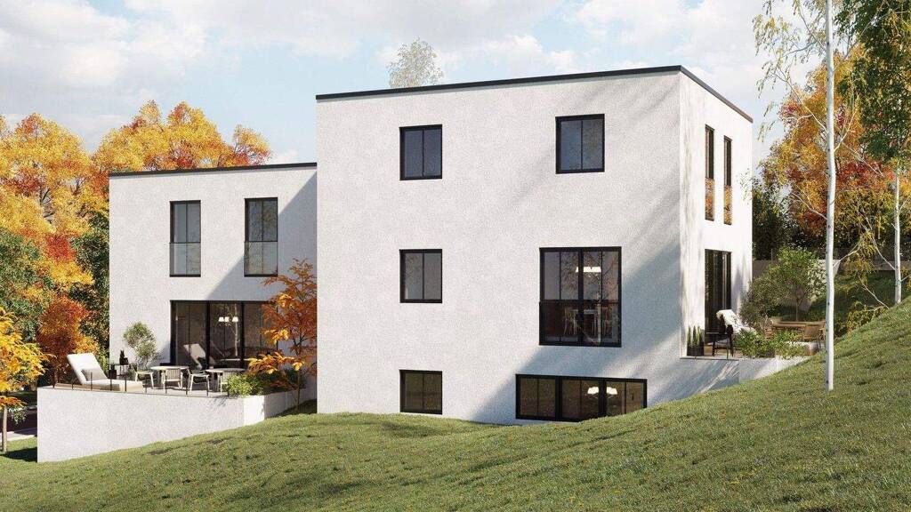 Modern, massiv gebaut und energieeffizient: Diese Doppelhaushälften bieten lichtdurchflutete Räume, klare Architektur und hochwertige Ausstattung. Große Fenster eröffnen einen weiten Blick ins Grüne.