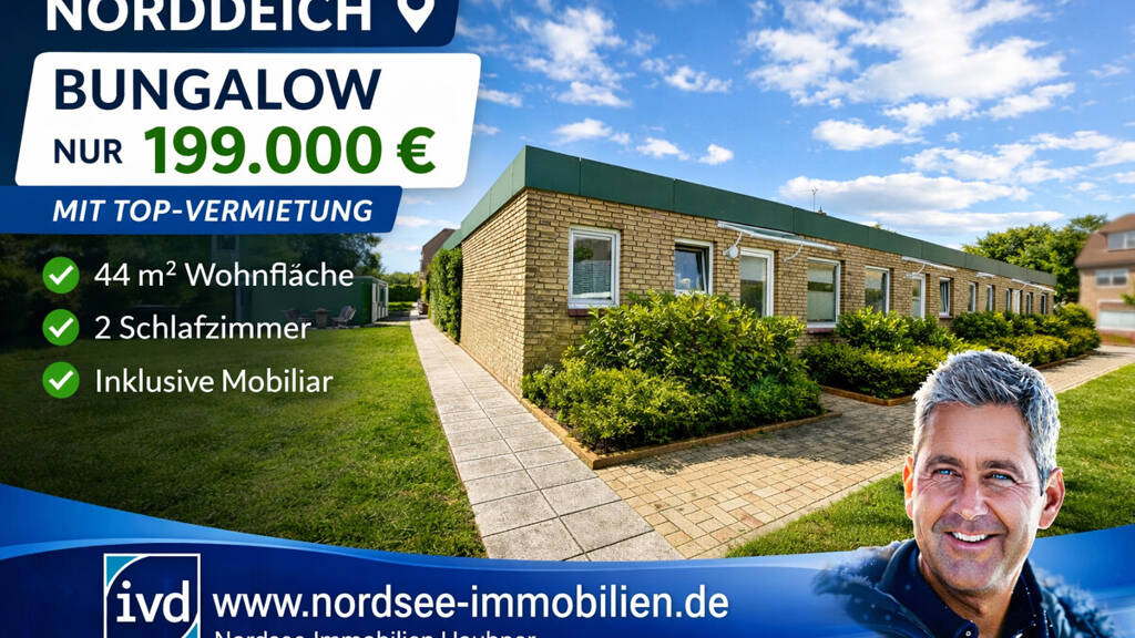 Die Wohnfläche verteilt sich auf ca. 41 m² bis 44 m² pro Einheit, insgesamt stehen 6 Bungalows zu jeweils € 199.000,- zur Verfügung. Dank der durchdachten Grundrissgestaltung mit 2 x Schlafzimmern, Tageslichtbad, einem hellen Wohnzimmer mit Essecke, einer separaten Küche mit Einbauküche, Abstellraum sowie einer sonnigen Terrasse bietet das Haus alles, was man sich von einem maritimen Ferienhaus an der Nordsee wünscht. Der Bungalow steht auf einem Erbpachtgrundstück in einer der TOP-Lagen Norddeichs.