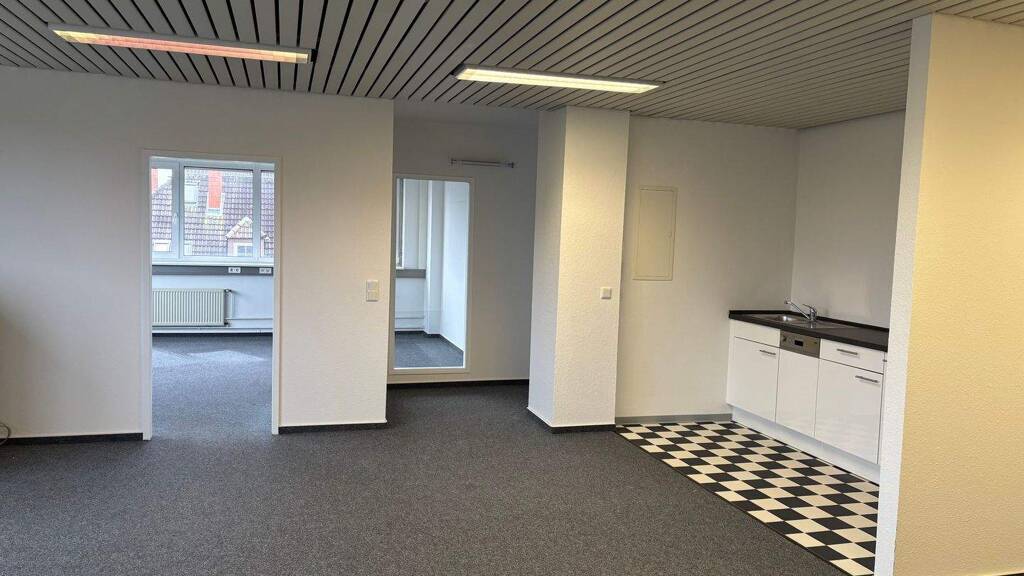 Schöne, helle und moderne 166 m² mit CAT6 + renoviert, zu sofort möglich. Dieses gepflegte Bürohaus befindet sich in unmittelbarer Nähe zu ÖPNV + BAB. Es handelt sich hier um eine sehr schöne, helle und modern aufgeteilte ca. 166 m² Bürofläche im 3. OG. Man erreicht sie über den Fahrstuhl und über das Treppenhaus. Aktuell ist sie in einen großen offenen Empfangsbereich mit offen gestalteter Küchenzeile, 4 Büroräume und WCs unterteilt. Die Büros sind mit Textilbelag und die WCs mit einer Bodenfliese ausgelegt. Für die CAT6 IT-Verkabelung sind Brüstungskabelkanäle vorhanden. Die Decken sind mit einer Akustikdecke abgehängt und mit Spiegelrasterleuchten ausgestattet. Außenbeschattung an der Südseite gehören mit zur Ausstattung. Parkplätze sind am Objekt vorhanden und können angemietet werden. Einzug zu sofort möglich.