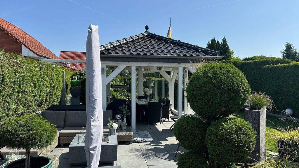 Dieser umfasst einen großzügigen Terrassenbereich mit einem überdachten Pavillion , der als Freisitz genutzt wird , sowie einen gepflegten Garten mit strukturierter Bepflanzung runden das Gesamtbild ab.