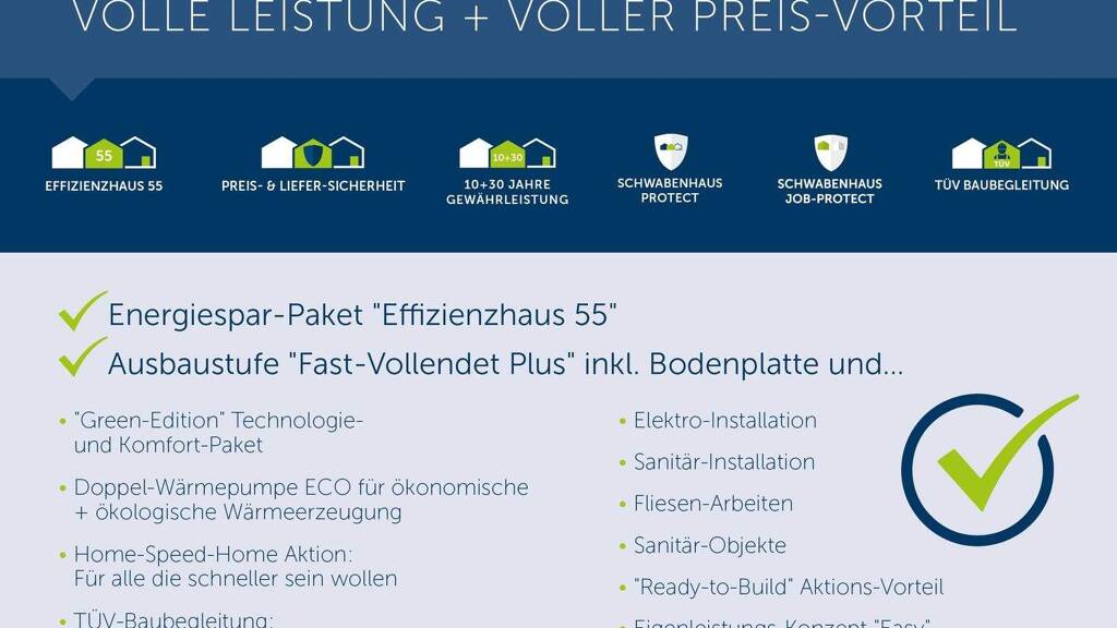 + 10 Jahre Gewährleistung (statt 5 Jahre nach BGB) + 30 Jahre Gewährleistung auf die Grundkonstruktion + Effizienzhaus 55 oder 40 + Zimmermannsmäßiger Dachstuhl aus Konstruktionsvollholz + Dacheindeckung mit Betondachsteinen namhafter Hersteller + Hochwertige Dachrinnen und Fallrohre aus Titanzink + Klima-Komfort-Bauweise + Schwimmender Estrich mit Wärmedämmung + Fugenlos auf der Baustelle verarbeiteter, atmungsaktiver Edelputz + Vollständige Badausstattung mit Markenprodukten und Echtglasduschabtrennung + Kunststoff-Fenster mit 3-Scheiben-Wärmeschutzverglasung + Elektrische Rollläden im Erd- und Obergeschoss + Fensterbänke innen in Naturstein oder Kunststein + Fensterbänke außen in Naturstein + Komplette Elektro-, Sanitär- und Heizungsinstallation inkl. Grundinstallation + Vollständige u. überdurchschnittliche Elektroausstattung inkl. Klingelanlage + Smart-Home-Technologie als intelligentes Gebäude-Management + Wärmepumpen-Heizung inkl. zentraler Wohnraum Be- und Entlüftung + Integrierte Wärmerückgewinnung im Winter, Kühleffekt im Sommer + Hochwertige, mehrschichtige Holz-Haustür mit Sicherheits-Schließzylinder und 5-fach Sicherheitsverriegelung + Dachflächenfenster mit Kipp- und Schwingfunktion sowie elektrischen Rollläden + Massiv-Vollholztreppe, verschiedene Varianten auch bereits im Standard + Bauherren-Haftpflicht-Versicherung inklusive + Absicherung gegen Arbeitslosigkeit und Krankheit + Bauleistungsversicherung inklusive + Individuelle Grundrissplanung und Anpassung auf Ihre Bedürfnisse + 16 Monate Festpreis-Garantie + Auf Wunsch mit Keller erhältlich + und noch vieles andere mehr!