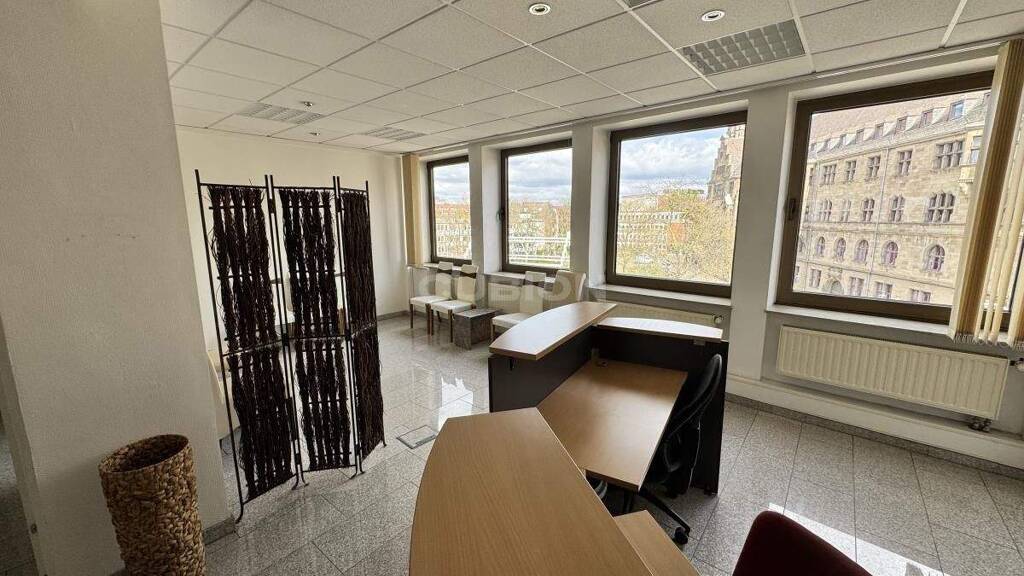 Die Ausstattung der Flächen entspricht zeitgemäßen Anforderungen. Teppichboden sowie Vinyl in Holzoptik schaffen eine angenehme und zugleich pflegeleichte Arbeitsatmosphäre. Die vorhandene EDV-Verkabelung vom Vormieter ermöglicht einen schnellen Start in den neuen Geschäftsräumen; die Kabelführung erfolgt über Bodentanks und Kabelkanäle und unterstützt eine flexible Positionierung der Arbeitsplätze. Elektrisch gesteuerte außenliegende Raffstoren sorgen für effektiven Sonnenschutz und tragen zu einem angenehmen Raumklima bei. Eine optionale Kühlung bietet zusätzlichen Komfort in den Sommermonaten. Rasterdecken mit integrierten Einbauleuchten gewährleisten eine gleichmäßige, arbeitsgerechte Beleuchtung. Eine Teeküche ist bereits vorhanden und schafft praktische Aufenthaltsmöglichkeiten für Mitarbeitende. Die Beheizung erfolgt effizient über Fernwärme. Ein Personenaufzug erschließt die Etagen komfortabel und unterstreicht die Nutzerfreundlichkeit des Gebäudes.