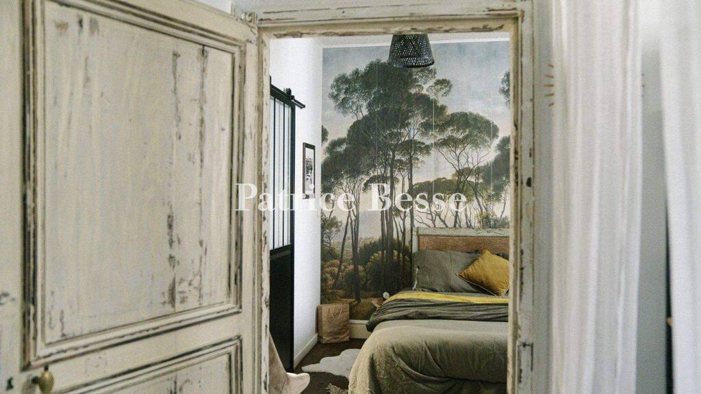 Directly opposite the bedroom, a dining room, with two windows facing the street, hardwood floors and a veined brown marble fireplace, communicates with a small dining nook with a window looking out on to the patio, while a few steps descend towards a fitted kitchen, located in the other wing, directly opposite the two living areas. Encased by windows and glass doors, it enjoys enchanting views and direct access to the patio and garden below, whereas a fireplace used as a wood-fired oven supplements the kitchen's different worktops and amenities.