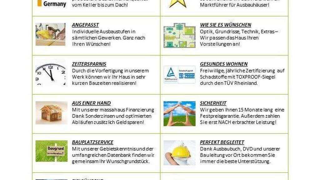 - über 3000 fertiggestellte Häuser in Südbayern - Besichtigung nach Absprache möglich - sprechen Sie mit unseren Bauherren - Seit über 40 Jahre Produktion von Qualitätshäusern in Deutschland - für Ihre Planungs-Sicherheit - 15 Monate Festpreisgarantie - Bezahlung des Hauses erst nach Montage und Abnahme/Freigabe durch Sie - Montage des Hauses innerhalb von 2-4 Tagen - Alle unsere Häuser können wir Ihnen als förderfähige KfW-Effizienzhäuser anbieten - 30 Jahre Gewährleistung auf Grundkonstruktion - Nachweislich gesundes Bauen: TÜV-Siegel "Toxproof" - Sicherheit und Gewährleistung eines deutschen Großunternehmens