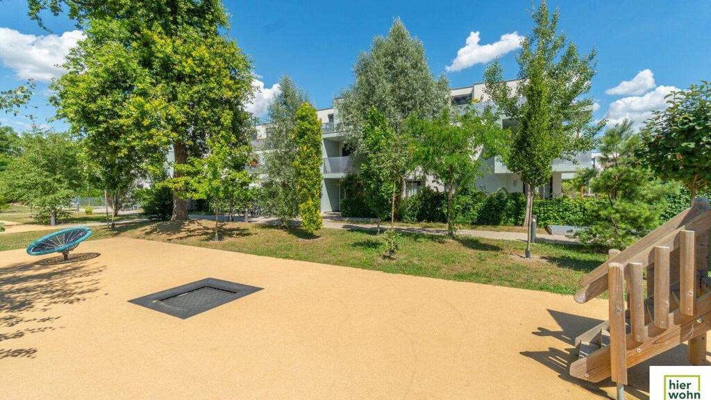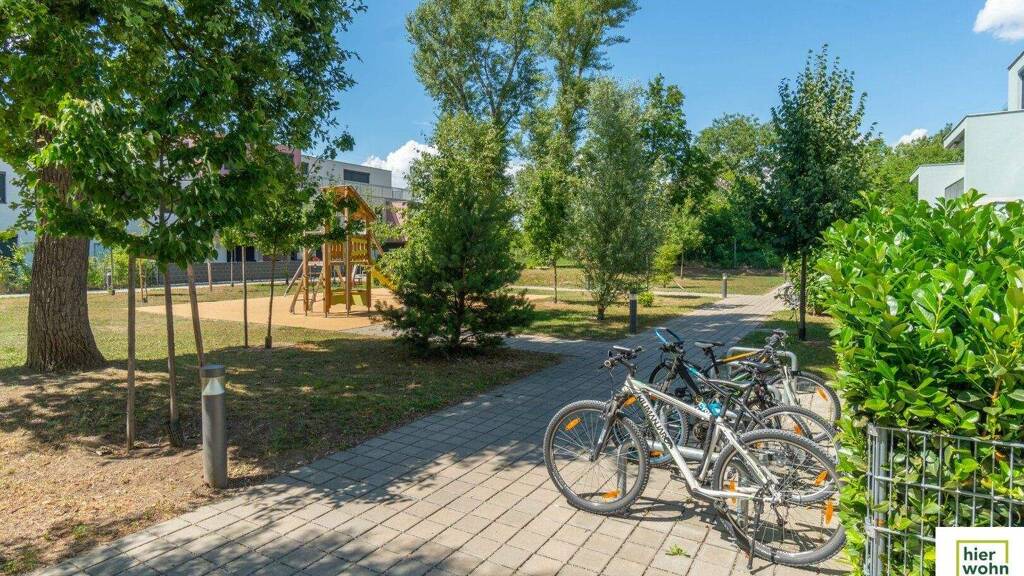 Fahrradräume sind im Kellergeschoss, Kinderwagenräume im Erdgeschoss verfügbar. Die Anlage hat auch einen großen Kinderspielplatz.