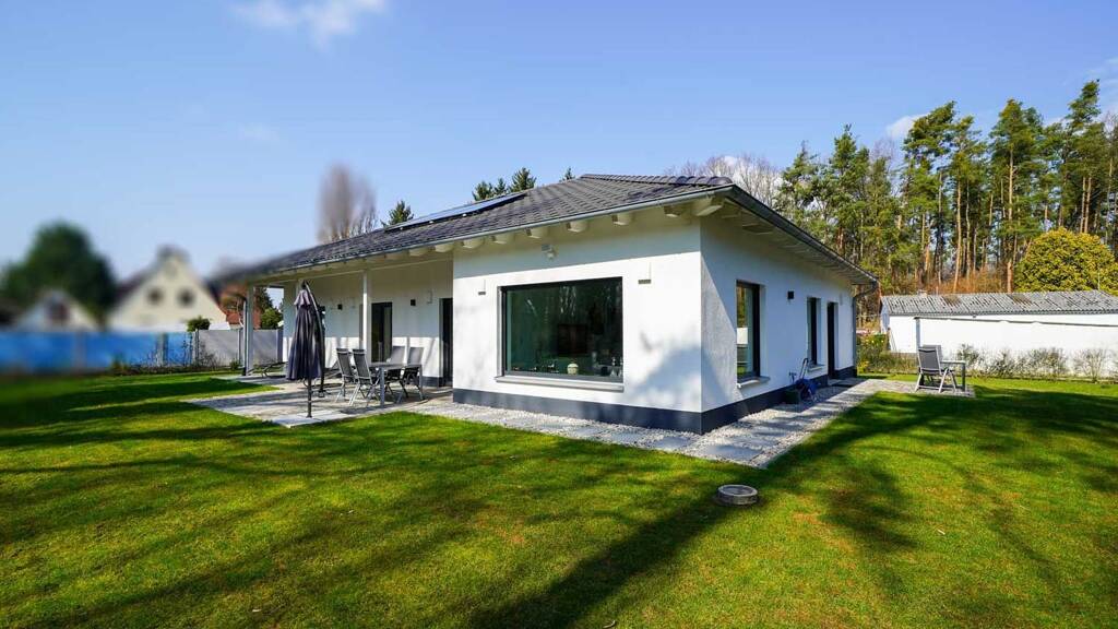 Der Bungalow (Baujahr 2021) liegt in einer Sackgasse ohne Durchgangsverkehr und überzeugt durch eine durchdachte Raumaufteilung auf einer Ebene. Herzstück des Hauses ist der großzügige Wohn-, Koch- und Essbereich mit großen Fensterflächen und direktem Blick in den Garten und zum angrenzenden Wald. Drei Schlafzimmer, ein Homeoffice sowie zwei Bäder bieten ausreichend Platz für komfortables Wohnen und flexible Nutzungsmöglichkeiten.