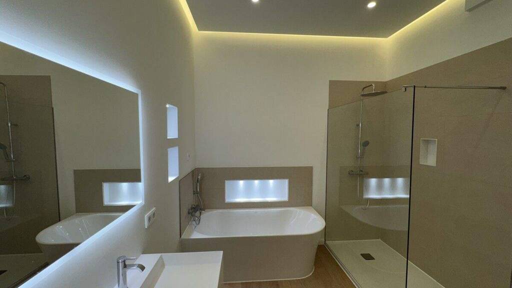 Auf insgesamt 160 m² Wohnfläche im ersten Obergeschoss entstanden nach einer Komplettsanierung helle und geräumige 4,5 Zimmer, eine Einbauküche mit hochwertigen Geräten und einer Kochinsel sowie zwei Bäder mit Fußbodenheizung.