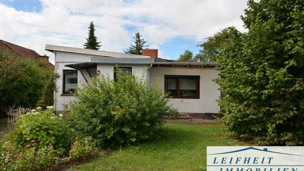 Der teilunterkellerte Flachbau überzeugt mit einer praktischen Raumaufteilung und viel Platz im Außenbereich. Über den Eingangsbereich gelangen Sie in die Wohnküche sowie in das gemütliche Wohnzimmer mit Kaminofen. Ergänzt wird das Raumangebot durch ein Schlafzimmer und ein weiteres Zimmer sowie eine praktische Abstellkammer. Zum Objekt gehören außerdem eine Garage, ein PKW-Stellplatz, eine Terrasse sowie Nebengelass mit zusätzlichen Abstellflächen. Der große Garten bietet viel Raum zur Erholung, für Freizeitaktivitäten oder individuelle Gestaltungsmöglichkeiten.