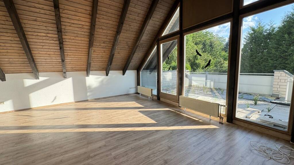 Dieses außergewöhnliche Zweifamilienhaus besticht durch die besondere Architektur. Die größere Wohneinheit erstreckt sich über das Erdgeschoss und Gartengeschoss. Auf der Eingangsetage befinden sich ein Wohn- und Esszimmer mit Zugang zur Terrasse, ein Gäste-WC, eine moderne Küche sowie ein Abstellraum. Über eine Treppe gelangt man in das Gartengeschoss, das in zwei Kinderzimmer, ein Schlafzimmer, zwei Abstellräume, ein Duschbad sowie ein Tageslichtbad mit Badewanne und Dusche aufgeteilt ist. Die kleinere Wohnung ist über einen Treppenturm erreichbar und erstreckt sich über die oberen Etagen. Dort befinden sich ein Schlafzimmer, ein Gäste-WC, ein Tageslichtbad mit Badewanne, ein Heizungsraum sowie zwei Balkone. Das Dachgeschoss beeindruckt durch ein großzügiges Wohn-Esszimmer mit offener Küche, einem Abstellraum und zwei weitere Balkone. Die Holzdecken, die Dachschrägen, die vier Balkone sowie der eingewachsene Garten mit Blick ins Grüne verleihen dem Haus ein besonderes Flair. Zu dem Haus gehören eine Garage sowie ein Stellplatz. Bei den Balkonen wurden Undichtigkeiten festgestellt, weshalb eine Sanierung erforderlich ist. Durch eine Überbauung der Balkone können Sie die Wohnfläche vergrößern und Ihren Wohntraum realisieren.