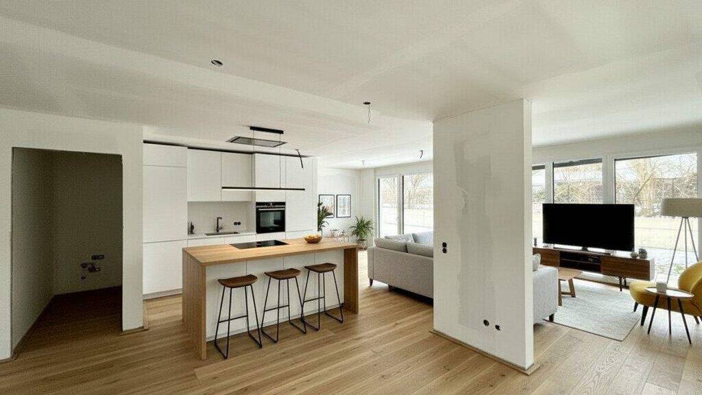 In den Wohn- und Schlafräumen werden hochwertige Parkettböden verlegt. Die Nassräume werden mit qualitativen Keramikbelägen verfliest. Die Wohnungen werden mittels einer Fußbodenheizung (Luftwärmepumpe) beheizt. Die Fenster sind 3-fach verglaste Kunststoff-Alu-Fenster. Jeder Wohnung ist ein Kellerabteil zugewiesen. In den DG-Wohnungen sind Klimaanlagen installiert. Auf Anfrage senden wir Ihnen gerne die detaillierte Bau- und Ausstattungsbeschreibung.