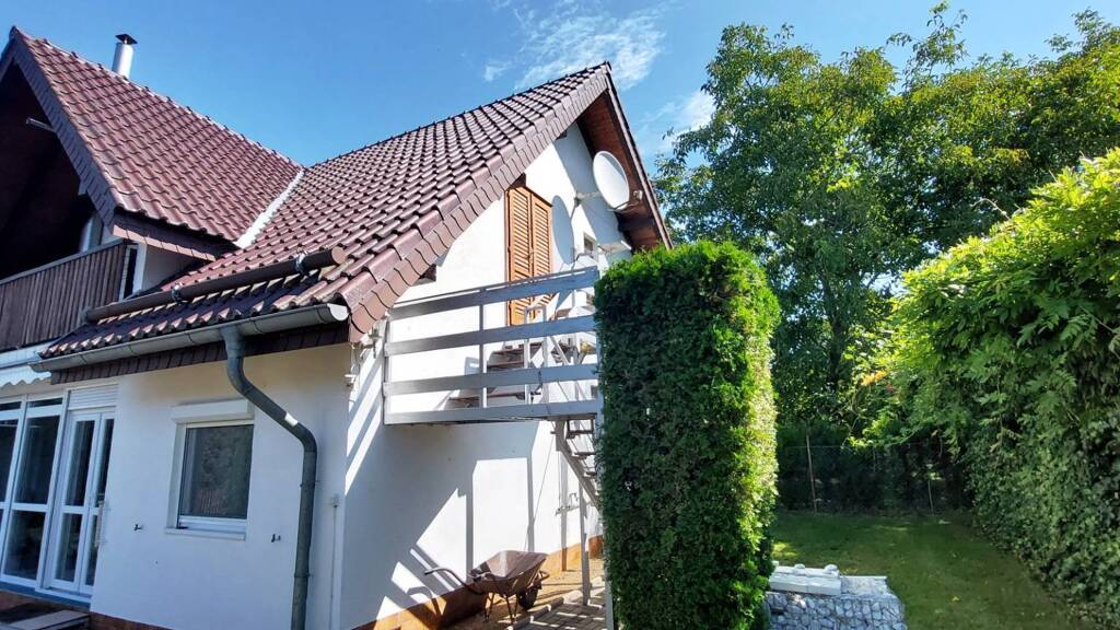 Zwischen den Ebenen können Sie sich über eine Innentreppe bewegen, es gibt aber auch eine Außentreppe, sodass die beiden Ebenen sogar getrennt genutzt werden können.