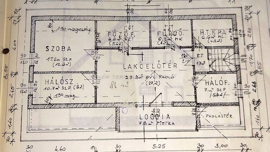 - Dachgeschoss (81 m2): Diele, Wohnzimmer mit Balkonanschluss, Badezimmer mit Badewanne und WC, Küche, 2 Schlafzimmer und ein derzeit als Esszimmer eingerichteter Raum und ein Abstellraum, die beide als Zimmer genutzt werden können.