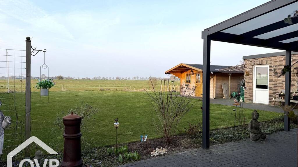 Die Terrasse ist überdacht und bietet neben viel Platz Weitblick über Wiesen und Felder, sowie Zugang zur Garage. Hier steht tollen Grillabenden mit Freunden und Familie nichts im Wege! Ebenfalls zum Garten gehört eine Blockhütte.