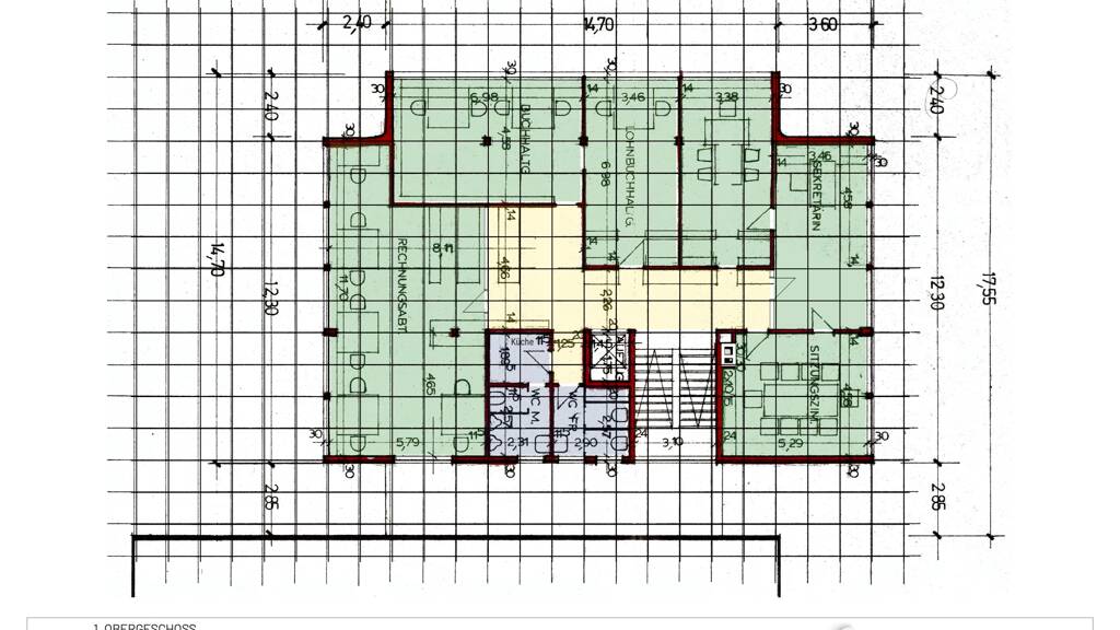 Das Bürogebäude verfügt über einen separaten Zugang mit Windfang. Das EG bietet ca. 265 m², das 1. OG ca. 170 m², das 2. OG ca. 240 m² und das 3. OG ca. 140 m². 2011 wurden die Fenster und die komplette Fassade gedämmt. Die Etagen sind über ein gemeinsames Treppenhaus erschlossen und von der Tiefgarage aus bis ins 2. OG über einen Personenaufzug barrierefrei zugänglich.