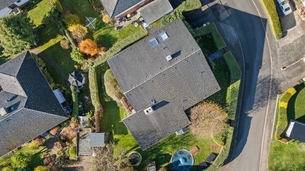 Das durch eine dichte Hecke eingefriedete Grundstück verleiht der mit 260 m² Wohnfläche großen, in den Hang gebauten Immobilie ein hohes Maß an Privatsphäre. Der nach Süden ausgerichtete Garten erstreckt sich über das 847 m² große Areal und eröffnet vielfältige Möglichkeiten für das Leben im Freien - von geselligen Grillabenden über Spiel- und Rückzugsbereiche bis hin zu entspannten Stunden am Pool.