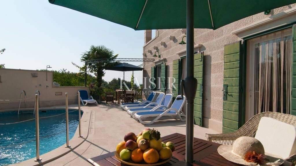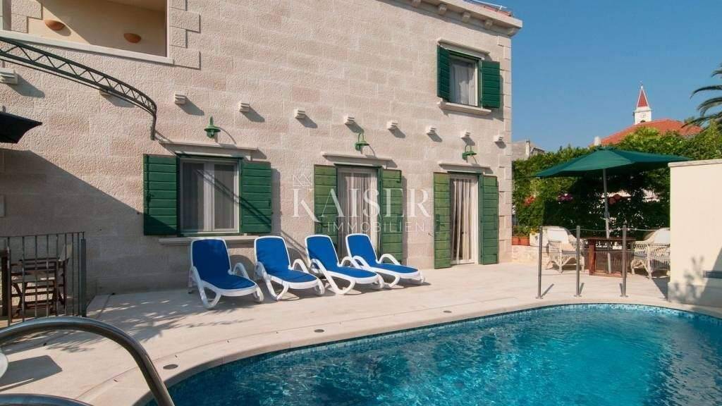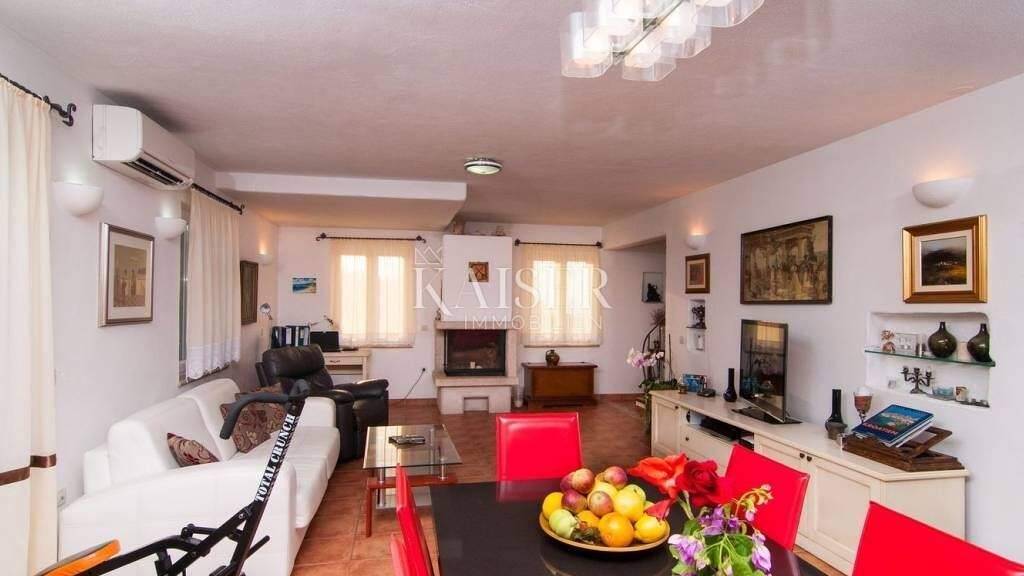 Kaiser Immobilien vermittelt den Verkauf einer wunderschönen Steinvilla auf der Insel Brac in der Nähe von Supetar, 900 m vom Meer entfernt. Diese Immobilie mit einer Gesamtwohnfläche von 300 m² erstreckt sich über drei Etagen. Im Erdgeschoss befindet sich ein geräumiger Wohnbereich, der mit einer Außenterrasse verbunden ist, was zusammen einen harmonischen Ort zum Verweilen und Entspannen bildet. Der Wohnbereich besteht aus einer Küche, einem Esszimmer und einem Wohnzimmer sowie einer Gästetoilette und einem Abstellraum. Im ersten Stock befinden sich zwei Schlafzimmer, jedes mit eigenem Balkon mit herrlichem Blick auf das Meer und das Grün der Insel Brac, und es gibt auch ein Badezimmer und eine Sauna. Im zweiten Stock - dem Dachgeschoss - gibt es zwei weitere Schlafzimmer mit eigenem Bad en suite, von denen eines Zugang zu einem Balkon hat. Im Garten gibt es einen 17 m² großen Swimmingpool, eine Liegewiese, einen überdachten Essbereich im Freien und einen Platz für Liegestühle - allesamt ein idealer Ort für Sommeraktivitäten im Freien. Dieses außergewöhnliche Anwesen im traditionellen dalmatinischen Bau- und Dekorationsstil, gelegen in mediterraner Umgebung, ist eine ausgezeichnete Wahl, sei es als Investition oder als Ort der Erholung und Entspannung. Die Maklerprovision für den Käufer beträgt 3% zuzüglich Mehrwertsteuer und wird im Falle des Kaufs der Immobilie nach Abschluss des ersten Rechtsgeschäfts fällig. ID-CODE 105-300