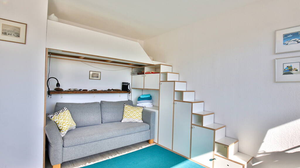 Die Wohnung verfügt über eine durchdachte, platzsparende Gestaltung mit integrierter Schlaflösung und zusätzlichen Stauraumelementen. Der Wohnbereich ist mit einem Sofa und TV ausgestattet und bietet ausreichend Platz für Erholung und Aufenthalt.