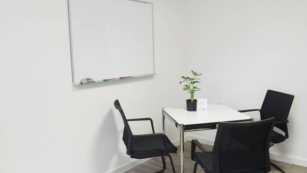 Das BĂĽro ist mit zwei groĂźzĂĽgigen Tischen und einer kleinen Sitzecke mit Whiteboard ausgestattet.