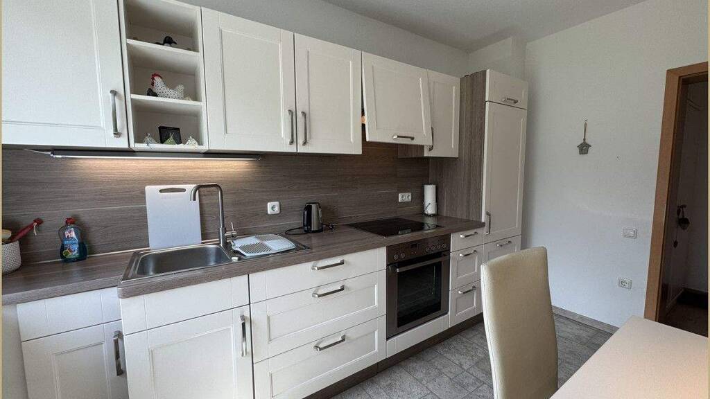 Die Wohnung bietet ein gemütliches Schlafzimmer mit einem Doppelbett (180 x 200 cm), ein einladendes Wohnzimmer, eine voll ausgestattete Küche mit Esstisch, ein modernes Bad mit Dusche sowie einen Balkon mit Blick ins Grüne. Auf Wunsch kann ein Babybett bereitgestellt werden.