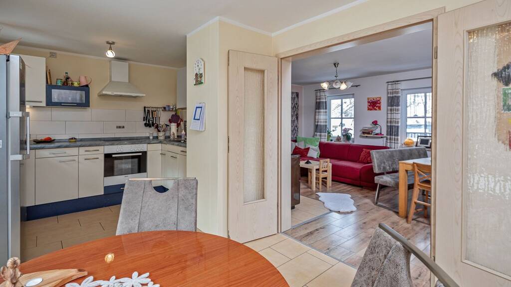 Über eine Treppe gelangen Sie in das 1.Obergeschoss und in den großen lichtdurchfluteten Wohnraum, welcher in eine helle und mit einer modernen EBK ausgestatteten Wohnküche mündet.