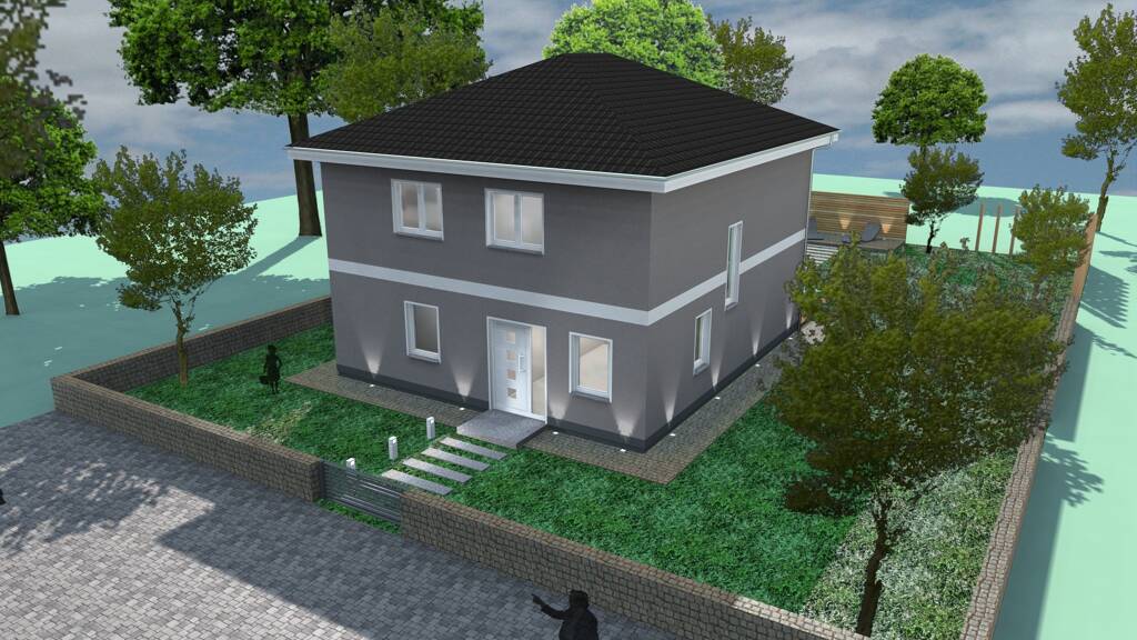 Raumaufteilung 4-Zimmer, Küche, Bad, Gäste-WC, HWR, Abstellraum * freistehende Stadtvilla mit Walmdach * Massivhaus (Außen- und Innenwände) * hochwertige Betondachsteine * 3-Scheiben Wärmeschutzverglasung (U-Wert Glas 0,7) * Rollläden aus Aluminium * Natursteinfensterbänke außen / Kunststeinfensterbänke innen * 2 Stellplätze