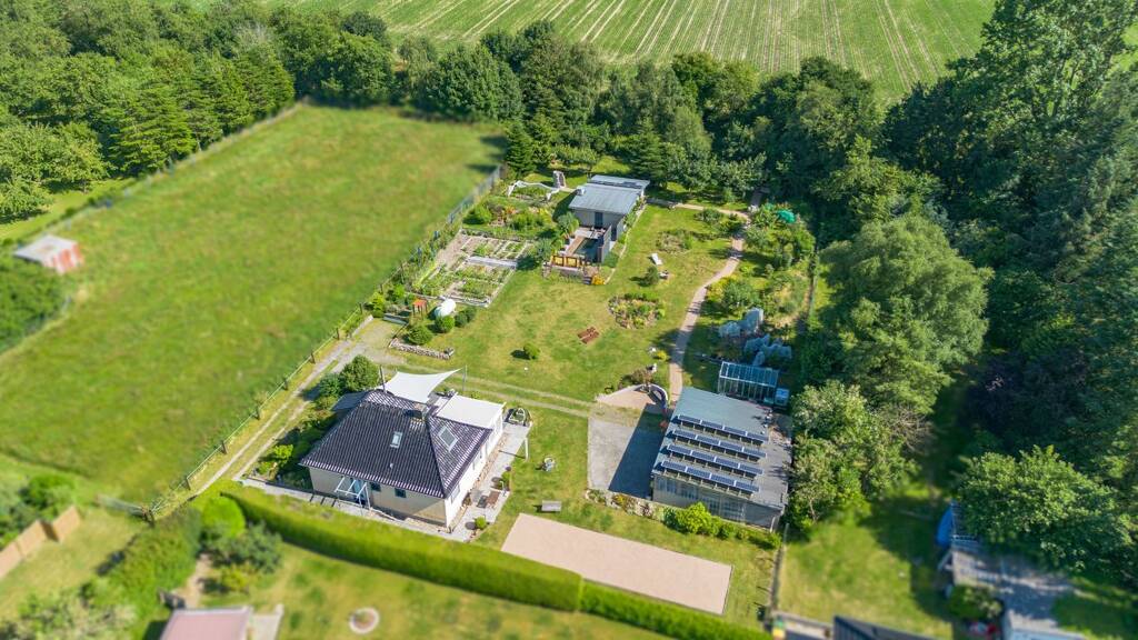 Dieses liebevoll sanierte Einfamilienhaus in zweiter Reihe aus dem Jahr 1965 bietet Ihnen auf ca. 87 m² Wohnfläche und ca. 3.001 m² Grundstück Wohnkomfort und Lebensqualität. Beim Betreten des Hauses erwartet Sie rechts ein modernisiertes Vollbad mit barrierefreier Dusche. Auf der linken Seite befindet sich ein gemütliches Schlafzimmer, das komfortables Wohnen auf einer Ebene ermöglicht. Der Flur führt Sie weiter in den offen gestalteten Wohn- und Essbereich mit angrenzender, hochwertig ausgestatteter Küche. Ein stilvoller, wasserführender Kaminofen sorgt an kühlen Tagen für wohlige Wärme und eine angenehme Wohnatmosphäre. Ein besonderes Highlight ist der südlich ausgerichtete Wintergarten, der direkt an die Küche anschließt und nahtlos als erweiterter Wohnraum genutzt werden kann. Von hier aus genießen Sie den herrlichen Blick in den liebevoll angelegten, weitläufigen Garten. Ebenfalls gelangen Sie vom dem Wintergarten auf die Terrasse. Im Dachgeschoss befinden sich zwei weitere Zimmer sowie ein separates WC. Ein praktischer Teilkeller bietet zusätzlichen Stauraum. Eine Solarthermie auf dem Hausdach und eine Photovoltaikanlage auf dem Garagendach senken Energiekosten und fördern nachhaltiges Wohnen. Die Außenanlage präsentiert sich als wahres Paradies: Ein außergewöhnliches Gartenhaus mit integriertem Wellnessbereich, Sauna und einem Kamin lädt zum Erholen und Abschalten ein. Ein traditioneller Pizzaofen rundet dieses Gartenhaus ab. Weitere Highlights dieser Oase sind das Wasserspiel, das man von der sonnigen Terrasse aus beobachten kann. Liebevolle Details und blühende Blumenbeete, die dem Garten eine besondere Wohlfühlatmosphäre verleihen. Für die Selbstversorgung sorgen Gemüsebeete und ein Gewächshaus. Eine Außendusche bietet an warmen Tagen zusätzliche Erfrischung im eigenen Gartenparadies. Eine Garage, ein Carport sowie mehrere Außenstellplätze bieten ausreichend Platz für Ihre Fahrzeuge und zusätzlichen Stauraum. Gerne zeigen wir Ihnen dieses Kleinod persönlich – wir freuen uns auf Ihre Anfrage!