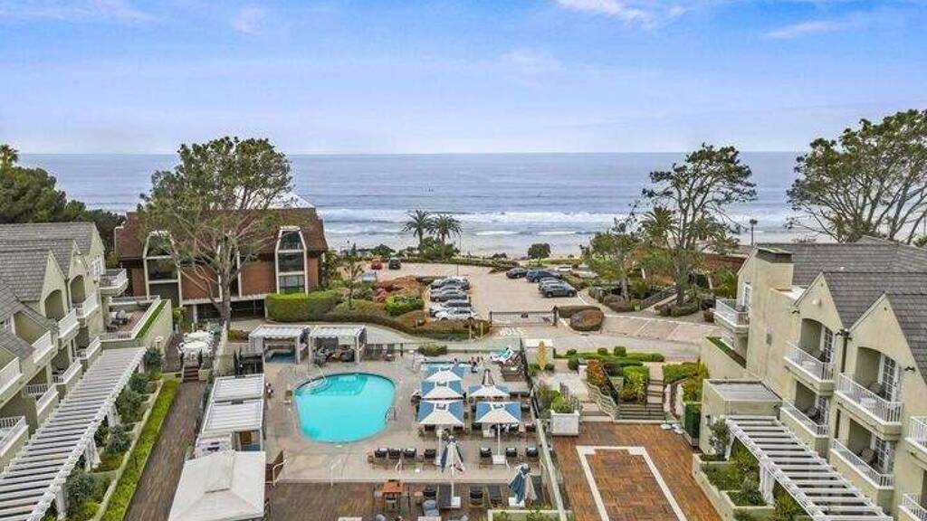 Desirable Top-Floor Resort Retreat in the Heart of Del Mar Village. Immerse yourself in effortless coastal living from this serene top-floor condominium tucked within a lush, green garden setting in the heart of Del Mar. Just steps, a mere 0.2 miles, from the sand, this beautifully positioned 1-bedroom ensuite residence with a separate guest bath and sitting area places you within easy walking distance of the ocean, Del Mar Plaza, world-class restaurants, charming boutiques, and scenic coastal walking trails. Savor tranquil garden views, morning sunshine and blue skies from your spacious private balcony-an ideal spot for morning coffee or sunset relaxation. Inside, the light-filled, beach-casual interior has been thoughtfully upgraded with warm light-oak luxury vinyl flooring, a refreshed kitchen and baths, a cozy fireplace, shutters, 2 TV's and two high-efficiency ductless mini-split systems for year-round comfort. Parking is abundant with one reserved underground space plus two additional exterior spaces. Even better, residents enjoy access to luxury L'Auberge Del Mar Hotel. Year round use of the hotel amenities, include a heated ocean-view pool and jacuzzi, a 24/7 fitness center, and tennis courts with pickleball, are included with ownership. Whether you're seeking a primary residence, a coastal second home, or a premium vacation rental, this top-floor retreat delivers the quintessential Del Mar lifestyle-where beach days, fine dining, boutique shopping, and scenic strolls are all right outside your door. Recent building renovations include new roof, fire resistance shingles, balcony repairs and waterproofing, window replacement, metal railing install, new canopy, etc. have been paid for by Seller. Schedule your private tour today and experience the best of Del Mar living.