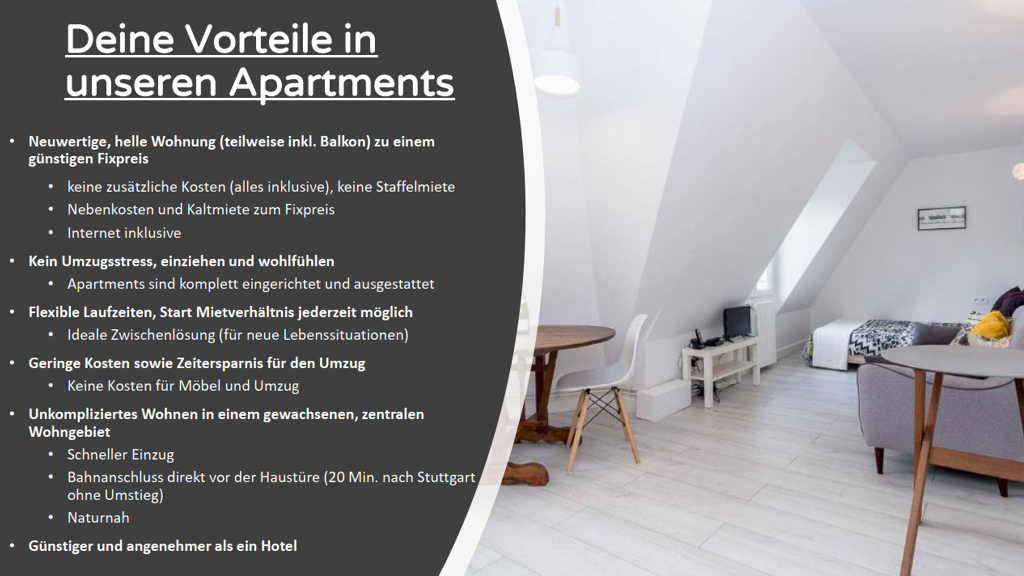 Warum dieses Apartment? Hier erwarten Sie keine versteckten Kosten oder Kompromisse: Sie genießen ein Rundum-sorglos-Paket, das modernsten Wohnkomfort mit maximaler Transparenz kombiniert. Ideal für alle, die stressfrei wohnen möchten – ob beruflich oder privat.