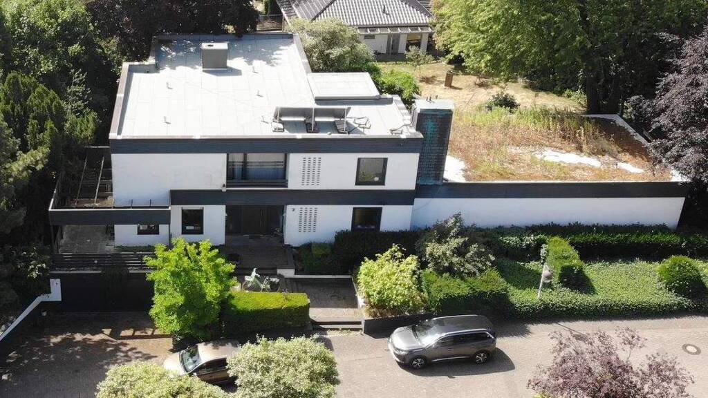 Dieses exklusive Architektenhaus liegt in einem ruhigen Wohngebiet mit stilvoller Nachbarschaft, umgeben von gepflegten Gärten und altem Baumbestand.