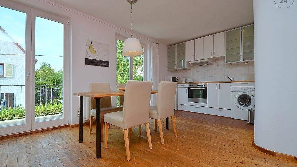 Die großzügige Wohnküche mit Esstisch und Zugang zum Balkon ist voll ausgestattet. Hier befindet sich auch die Waschmaschine.