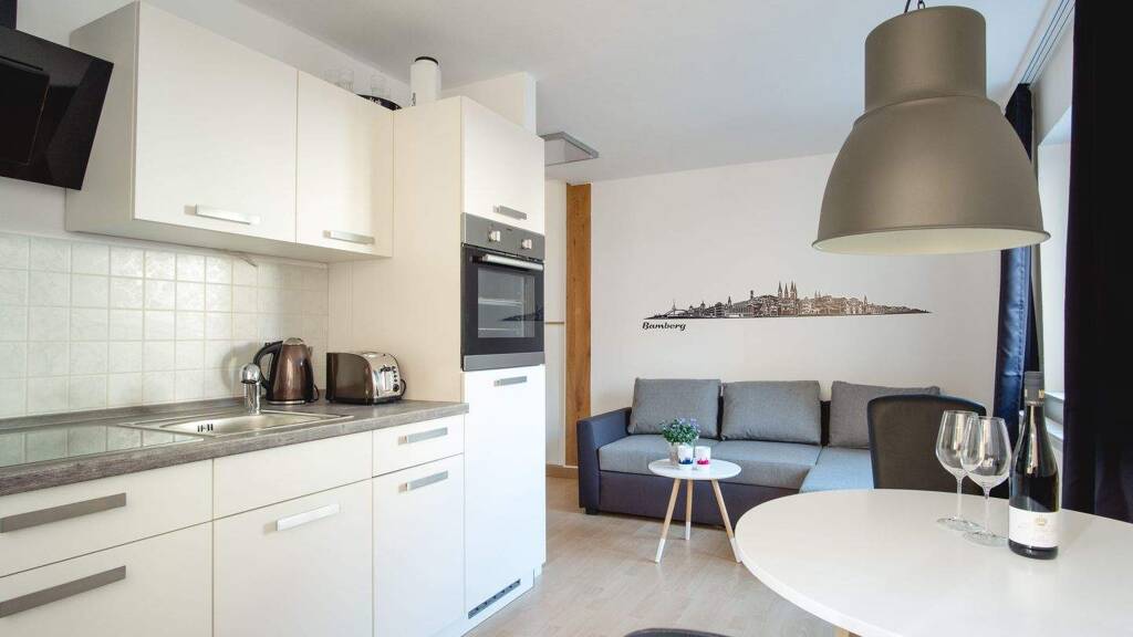 OBERGESCHOSS - Neu saniertes Bad mit Badewanne sowie integrierter Dusche und eigener Waschmaschine. Föhn und Handtücher liegen für Sie ebenfalls bereit. - Abgetrenntes Schlafzimmer mit Doppelbett (180x200) incl. Bettwäsche sowie Blick auf den Bamberg Dom. Das Schlafzimmer kann für einen erholsamen Schlaf abgedunkelt werden. - Kleiderschrank - Kommode - Wandspiegel