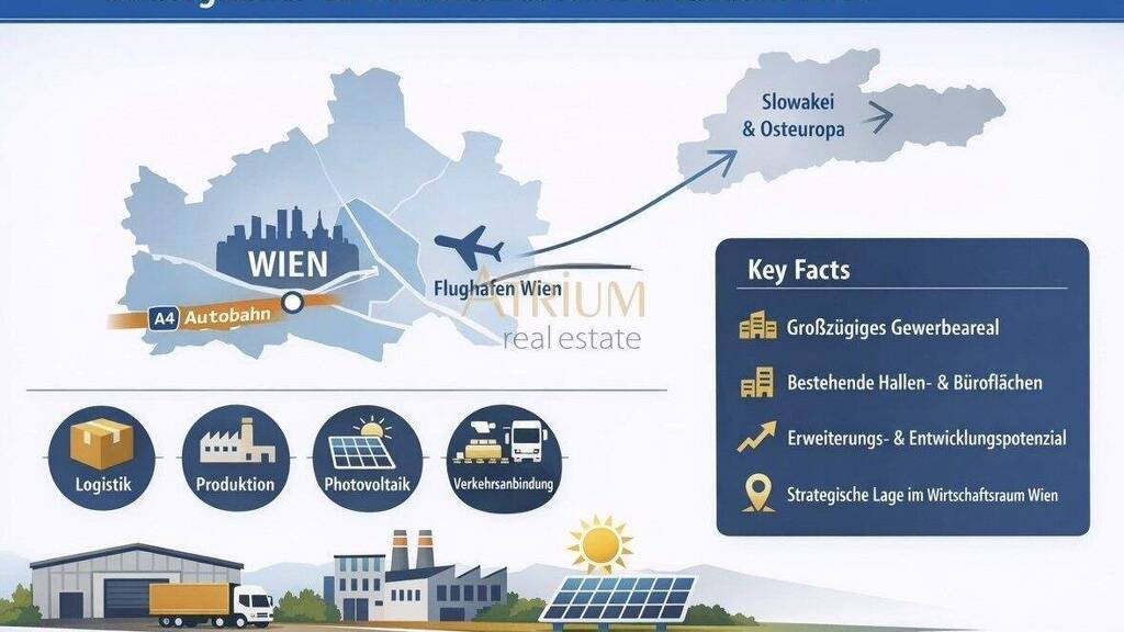 Der Standort überzeugt durch seine strategische Lage nahe Wien, die ausgezeichnete Anbindung an internationale Verkehrsachsen sowie durch bestehende Hallen-, Büro- und Freiflächen mit Entwicklungspotenzial.