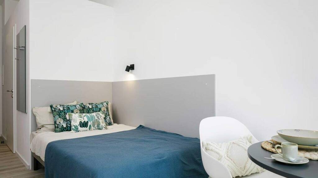 * Ein bequemes Bett * Einen Einbauschrank und ein Bücherregal * Einen Schreibtisch, der für produktives Arbeiten konzipiert ist * Eine voll ausgestattete Küchenzeile für Ihre kulinarischen Experimente * Ein privates Badezimmer mit moderner Dusche