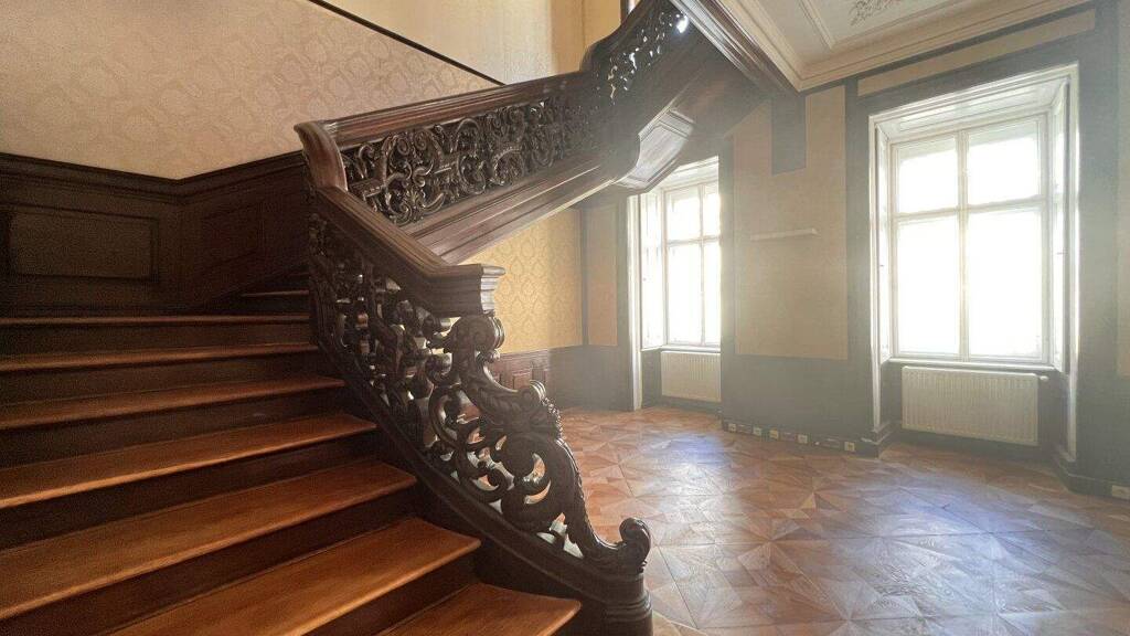 Die straßenseitigen Flächen im 1. und 2. Stock sind über eine wunderschöne original erhaltene Holztreppe verbunden.