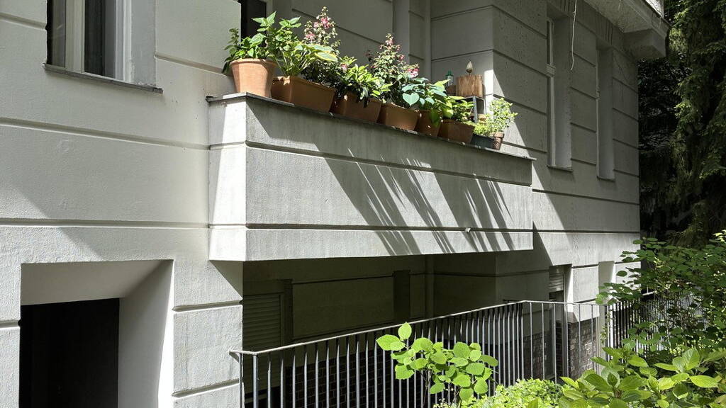 Das Hochparterre mit Friedenauer Vorgarten hat an drei Seiten der Wohnung Fenster (etwa 2,5?Meter über Straßenniveau) mit Blick ins Grüne. Somit bietet die Wohnung überraschend viel Licht ohne Einblicke von außen, angenehme Raumtemperaturen im Sommer und nur zehn Stufen bis zur Haustür.