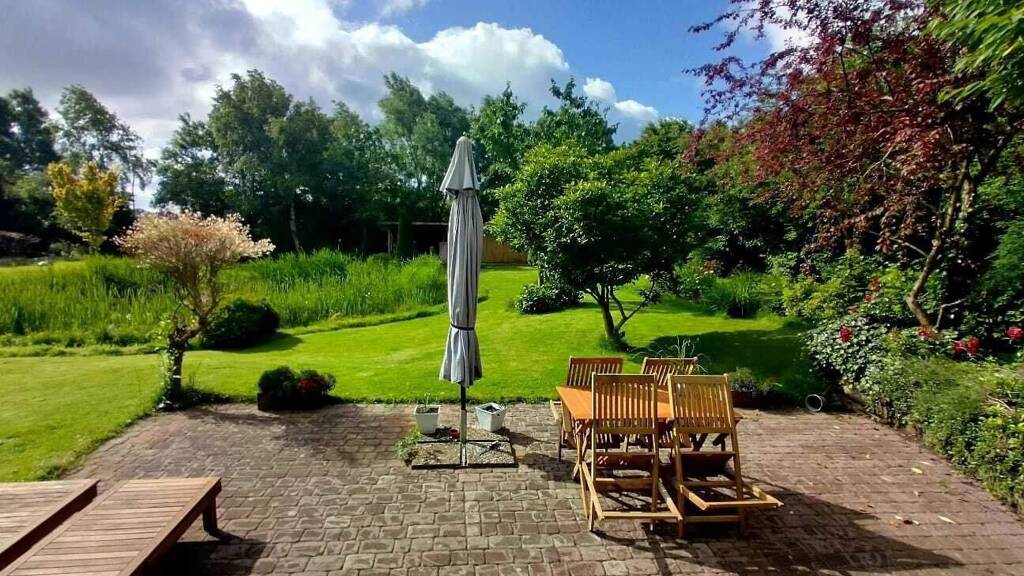 Das Grundstück liegt abseits der Ortschaft an einem alten Innendeich und bietet sowohl Weitblick als auch eine ruhige, geschützte Umgebung. Es ist von heimischem Baumbestand und Sträuchern umgeben und vollständig eingezäunt, was es besonders hundefreundlich macht. Ein zentral gelegener Seerosenteich mit Holzbrücke sowie einem Sitzplatz lädt zum Entspannen ein, zusätzlich gibt es eine großzügige Bangkirai-Sonnenterrasse. Neben dem Hauptgebäude befinden sich ein Gartenblockhaus mit Strom-, Wasser- und WC-Anschluss sowie ein Schuppen mit Starkstromanschluss. Die Fläche des Grundstücks misst ca. 3443 m².