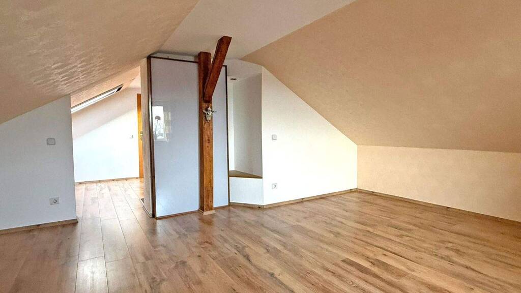 Im Obergeschoss erwarten Sie ein großzügiges Schlafzimmer mit ca. 21 m², ein Kinderzimmer mit ca. 17 m² und Zugang zum Balkon (ebenfalls mit Markise) sowie ein weiteres Zimmer, das sich ideal als Arbeits- oder Gästezimmer nutzen lässt. Von diesem Raum führt eine Treppe zum ausgebauten Dachboden, der zusätzliche Nutzfläche bietet.