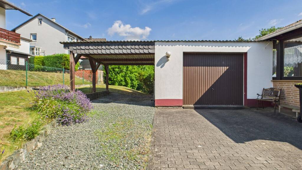 Ein Carport sowie eine Garage bieten ausreichend Stellfläche für Fahrzeuge und zusätzlichen Stauraum.