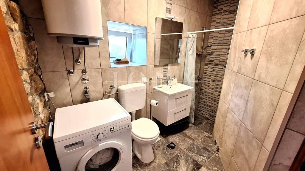 Das Haus mit einer Fläche von 115 m2 erstreckt sich über das Erdgeschoss und den ersten Stock. Im Erdgeschoss gibt es ein Wohnzimmer mit Esszimmer und Küche, ein Badezimmer und eine große überdachte Terrasse, die mit einem angelegten Garten verbunden ist. Eine Innentreppe führt in den ersten Stock, wo sich zwei Schlafzimmer und ein großes Badezimmer mit Badewanne befinden. Das Schlafzimmer und das Badezimmer haben Zugang zur Terrasse mit Blick ins Grüne. Bei der Renovierung wurden hochwertige Materialien verwendet. Im Garten gibt es einen Swimmingpool mit Sonnendeck, einen Kamin und einen Abstellraum. Der Garten verfügt über ein Bewässerungssystem und ist im mediterranen Stil gestaltet. Am Eingang des Hofes gibt es Parkplätze für zwei Fahrzeuge und einen überdachten Bereich für Fahrräder.